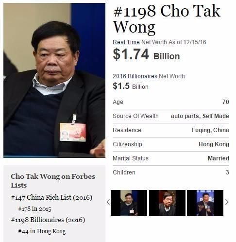 在2016年福布斯全球億萬(wàn)富豪排行榜上,曹德旺以17.4億美元的身家位列第1198名。